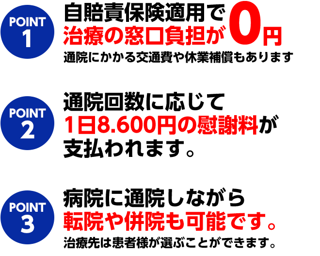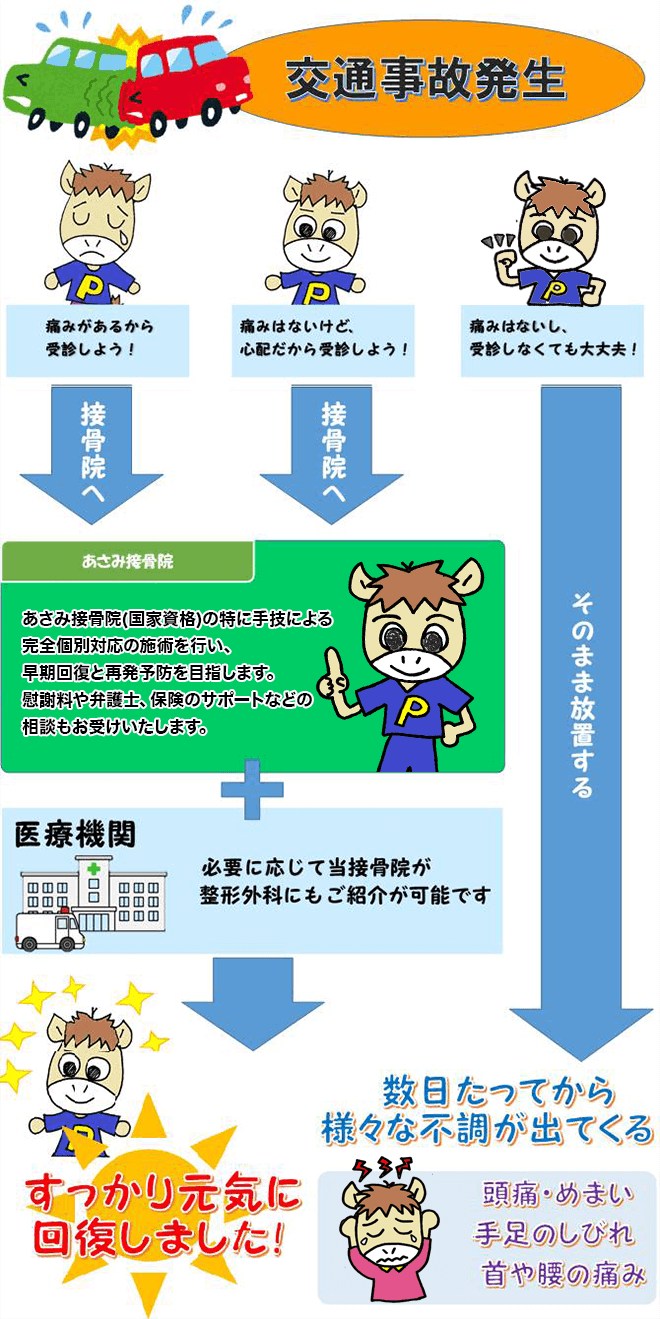 交通事故直後は誰しも混乱しており、怪我をしていないと感じていても、その場を離れてから痛みが出てくることが多いです。症状が出ていなくても必ず当日受診してください。病院での精密検査を受け、身体の状況を確認しましょう。事故から病院への受診が遅れると事故との誘因関係が認められず、治療費などの支払いが受けられなくなります。当院に受診されたら、当院と連携している整形外科へ御紹介させていただきますので、交通事故に遭われたら当院へご連絡、相談してください。